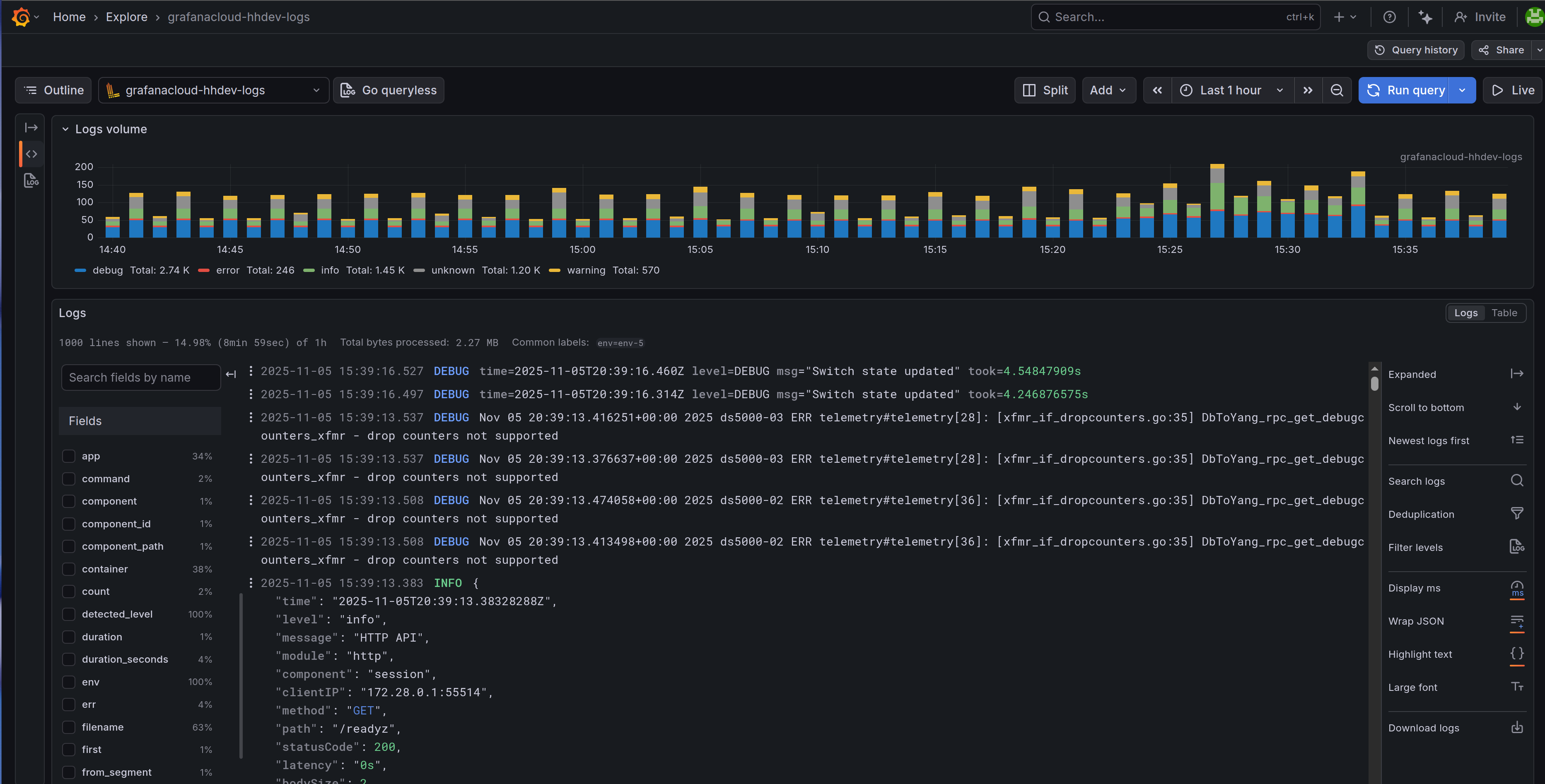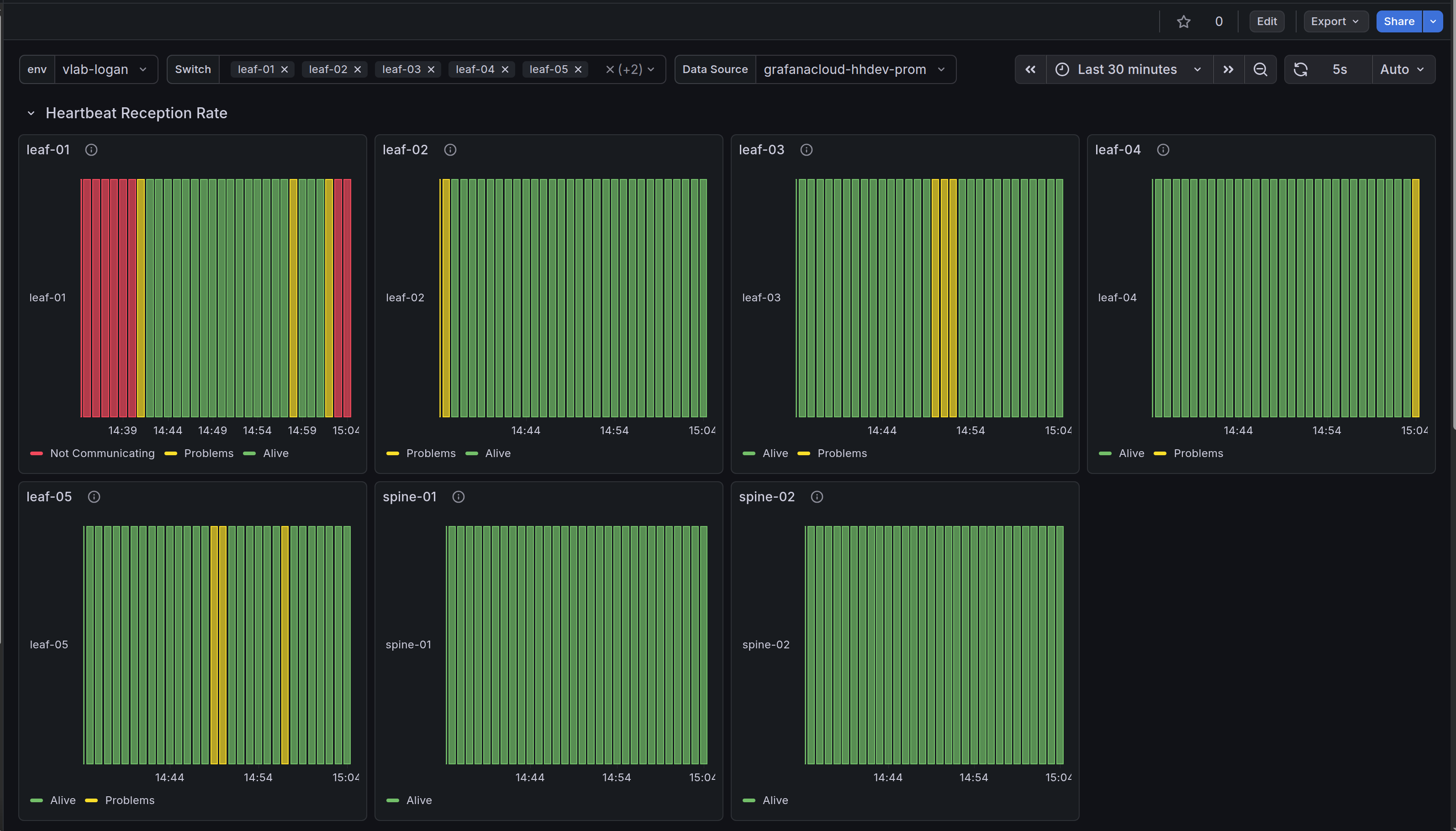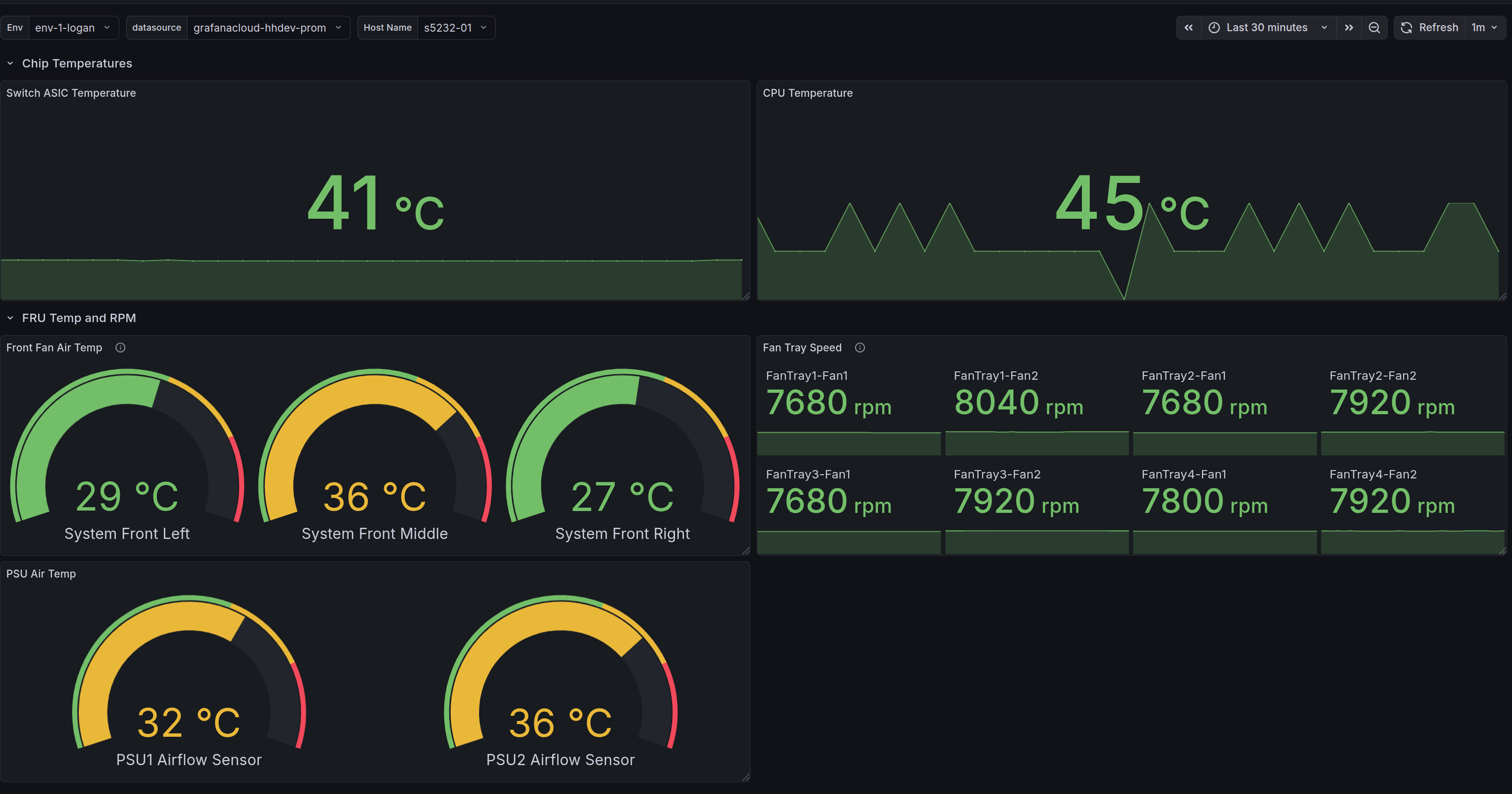 To provide monitoring for most critical metrics from the switches managed by Hedgehog Fabric there are several Dashboards that may be used in Grafana deployments. Make sure that you've enabled metrics and logs collection for the switches in the Fabric that is described in Fabric Config section.